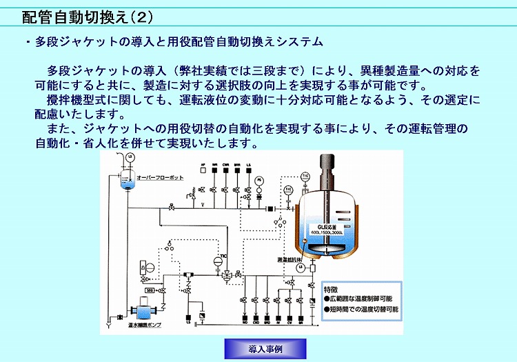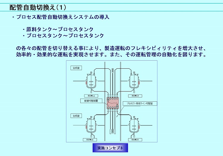 - 例えば、プロセス配管自動切換えシステムの場合、「原料タンク~プロセスタンク」「プロセスタンク~プロセスタンク」の各々の配管を切り替えて、製造運転のフレキシビィリティ増大と効率的・効果的な運転を実現します。また、その運転管理の自動化を図ります。