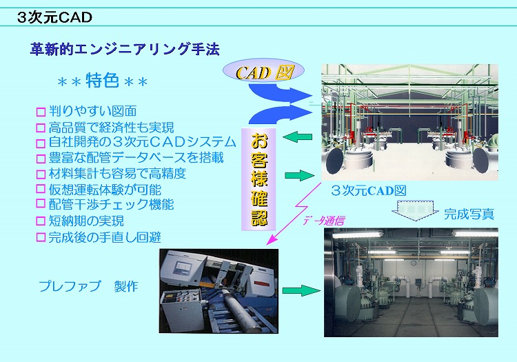 - 配管勾配、許容分岐長さなど厳密な配管検査を必要とされるGMPでは、 詳細な確認の行える3次元CADシステムが不可欠です。 また、適切な操作空間の確保、円滑なバルブの操作性確保もGMP上重要であり、3次元CADのバーチャルプラントツアーにて確認可能です。