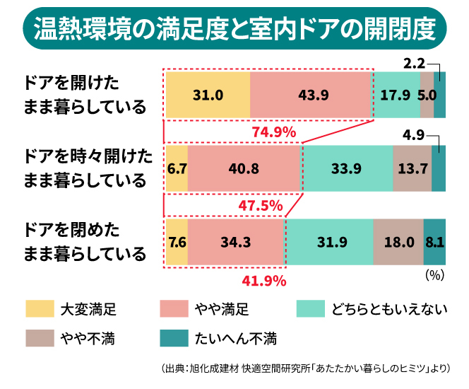 ある調査によると、家中どこでも温度・湿度が均一な温熱性能の高い家では、ドアを開け放して暮らす人が多く、温熱環境に対する満足度も高いとのこと。ドアを開けたままの開放的な暮らしは、家族のコミュニケーションにどのような影響をもたらすのでしょうか。