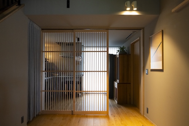 ドアを開け放して居室をゆるやかにつなぐ開放的な暮らしには「引き戸」が向いていると言えます。なかでも、戸をスライドさせ、壁と壁の間の戸袋に引き込む「引き込み戸」は、壁と完全に一体化して見た目がスッキリします。