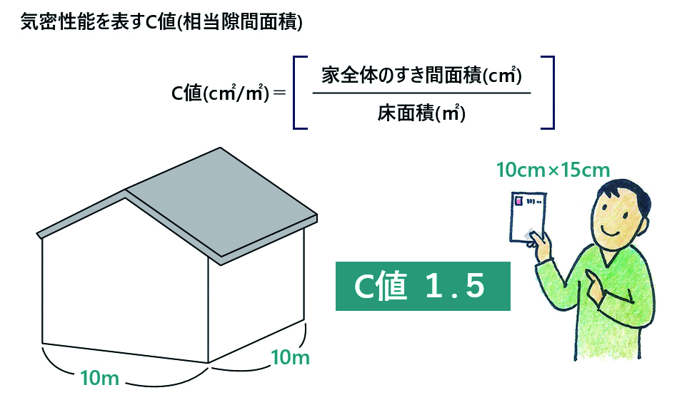 例えば、C値が1.5㎠/㎡であれば、100㎡の床面積に150㎠の隙間(はがき一枚分)があることを意味します。