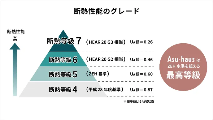 断熱等級は1~7で評価され、数値が高いほど断熱性能が高くなります。旭化成ホームズの「Asu-haus(アスハウス)」は最高等級7を基準にしています。