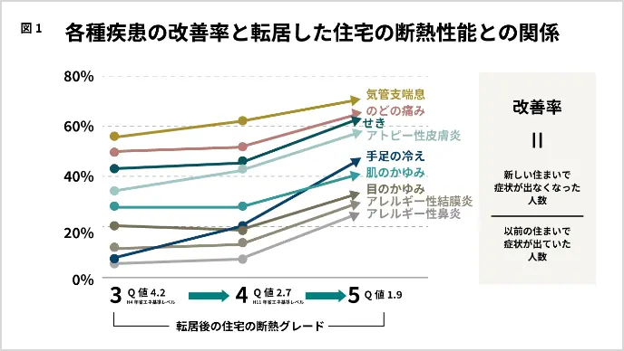 近畿大学・岩前篤教授の研究によると、断熱性能が高い住宅ほど入居後に持病や体調不良が改善した人の割合が高く、快適な温熱環境が健康にも良い影響を与えることが示されています。