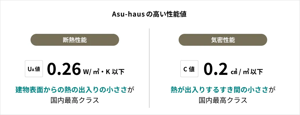 高気密・高断熱性能と配慮を標準で備えているのが、旭化成ホームズの「Asu-haus(アスハウス)」です。「Asu-haus」は、標準で断熱等級7(UA値0.26W/㎡K以下)、気密性能C値0.2㎠/㎡以下を備えた高気密・高断熱住宅です。