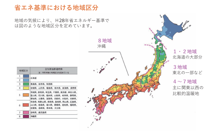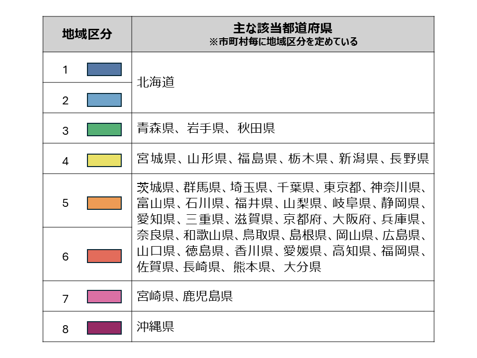 UA値・ηAC値は、地域ごとに断熱等級を満たすための基準値が決まっています。これを「地域区分」と呼び、「1」から「8」までの8段階で構成されています。