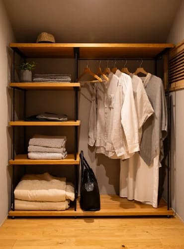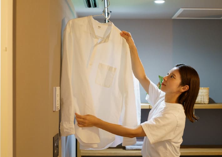 Asu-hausは家庭用エアコン1台で全館空調を実現。扇風機や加湿器も最小限で済み、季節家電の収納も不要に。収納は変化に対応できる設計で、出し入れもスムーズ。