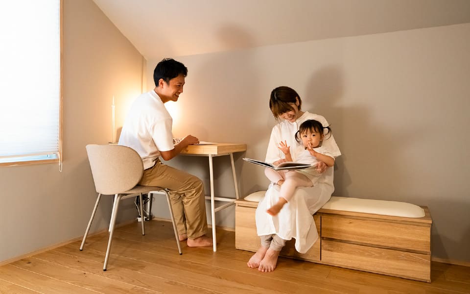 風が直接当たらない空調で、足元から頭まで快適な温度・湿度を保ちます。集中しやすく、在宅ワークや勉強にも最適。自然素材の建具や柔らかな照明が木のぬくもりを感じさせ、心安らぐ空間をつくります。