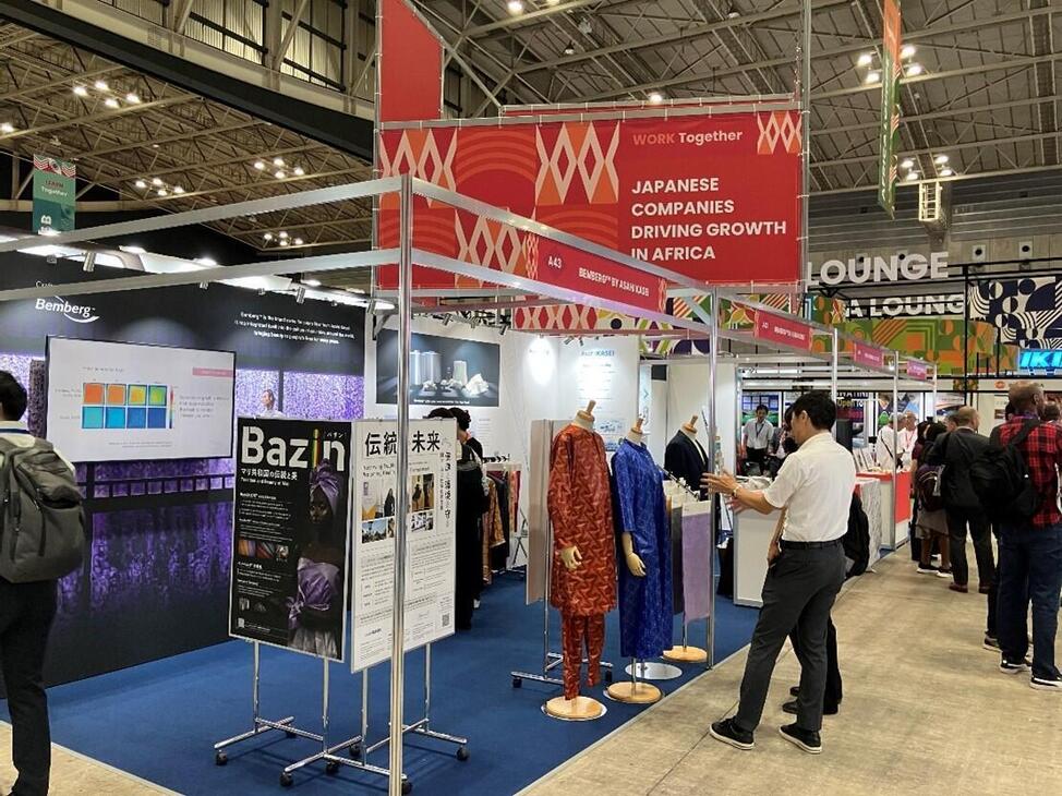 旭化成のブースでは、西アフリカ・マリ共和国の伝統民族衣装「バザン(Bazin)」の生地の素材としてベンベルグ®が使用された「BemBAZIN™」の製品サンプルを展示。加えて、国連開発計画(UNDP)およびイタリアの高級織物メーカーBrunello S.p.A.と連携し、現地の染色産業が抱える社会課題の解決に向けた「Bazin染色家支援プロジェクト」の取り組みを紹介しました。