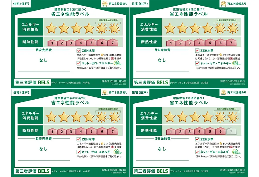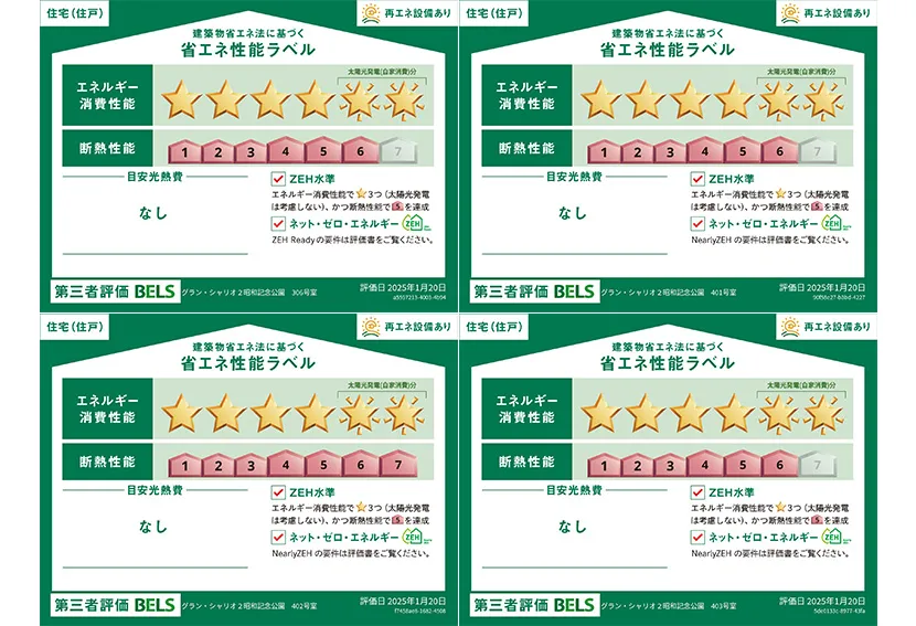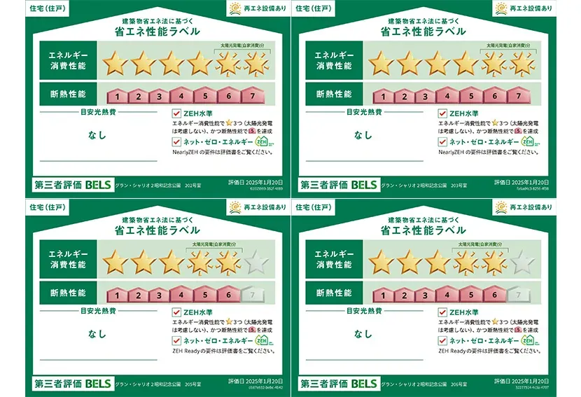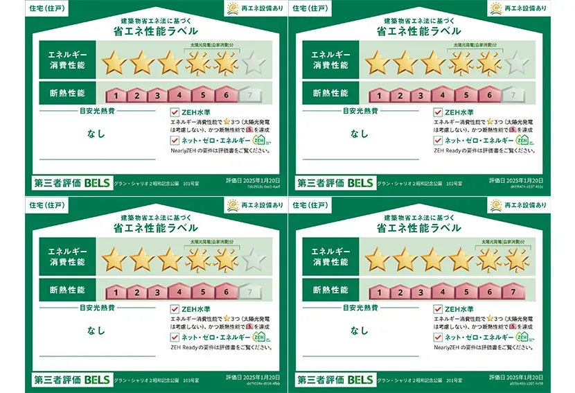 ZEH-M対象物件 | エネルギー消費量 住棟53%削減、101号室46%削減、102号室49%削減、103号室45%削減、201号室56%削減、202号室57%削減、203号室57%削減、205号室49%削減、206号室48%削減、301号室56%削減、302号室57%削減、303号室57%削減、305号室52%削減、306号室53%削減、401号室53%削減、402号室56%削減、403号室53%削減 |