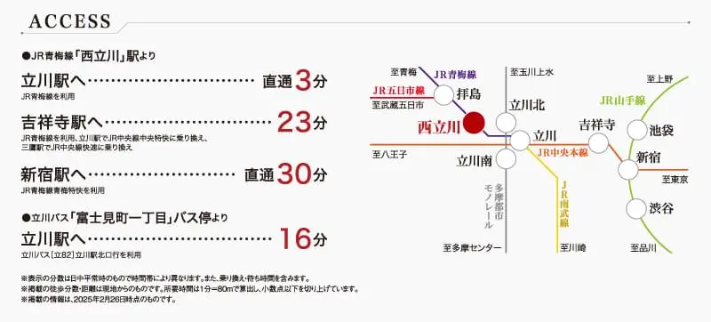 最寄り駅のJR青梅線「西立川」駅からは、徒歩8分。閑静な住宅街にありながら、お出かけやお食事には繁華街の立川駅へと1駅でアクセスできる便利な場所です。