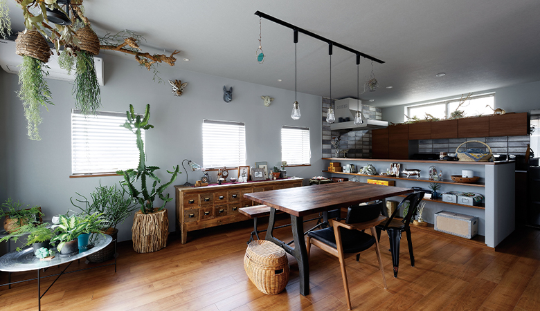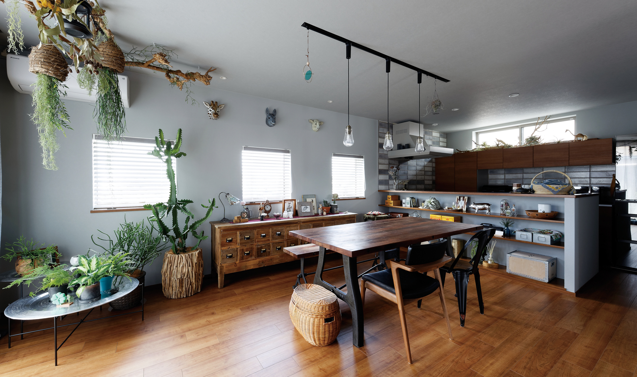 3階子世帯LDKには、キッチンカウンターや間仕切りなど“見せる収納”を採用。壁を淡いグレーにすることで、家具や小物、グリーンなど多彩なアイテムを調和させています