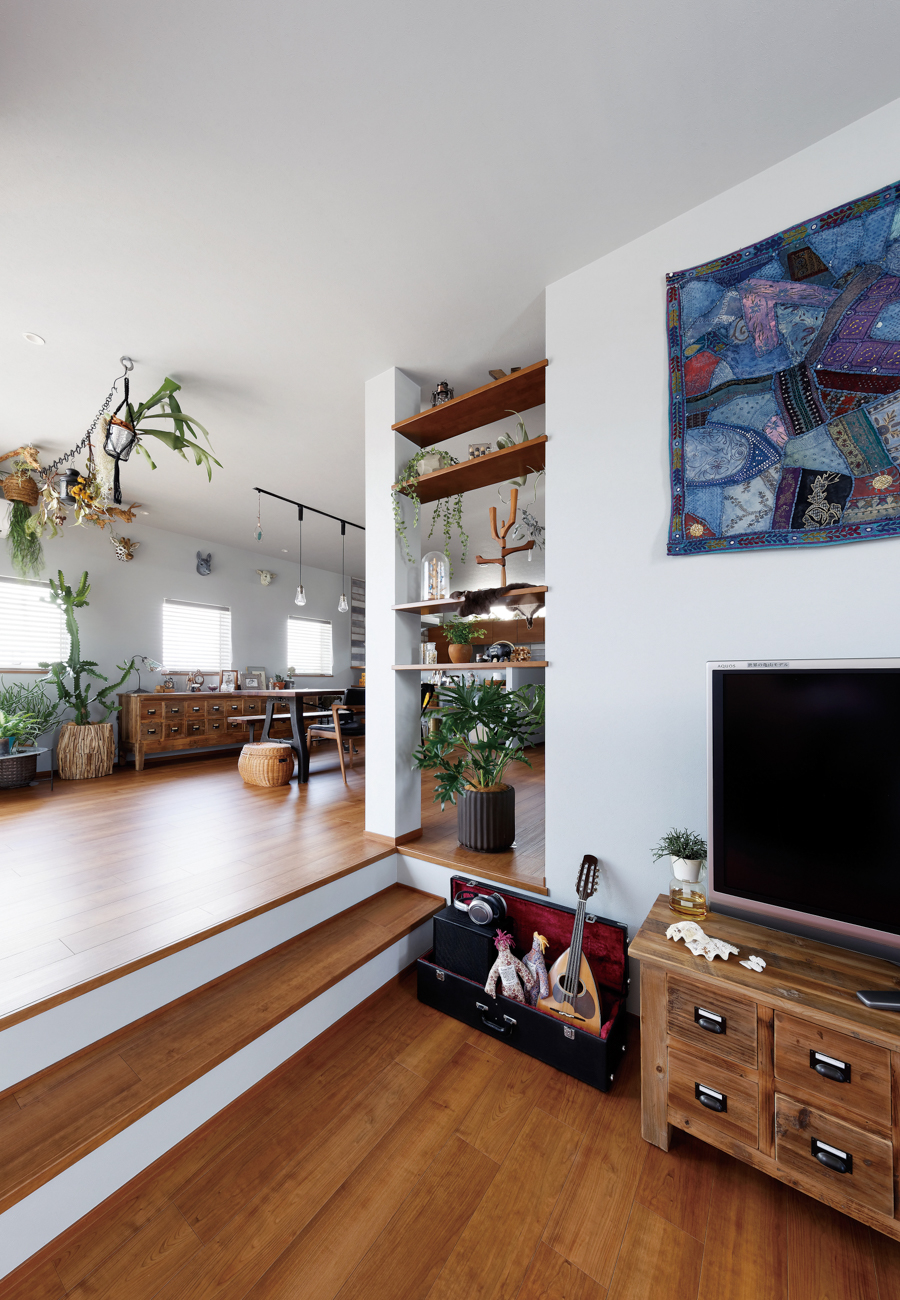 リビングにはダウンフロアを採用。段差や間仕切りの棚で、ひとつながりの空間をゆるやかに分けています