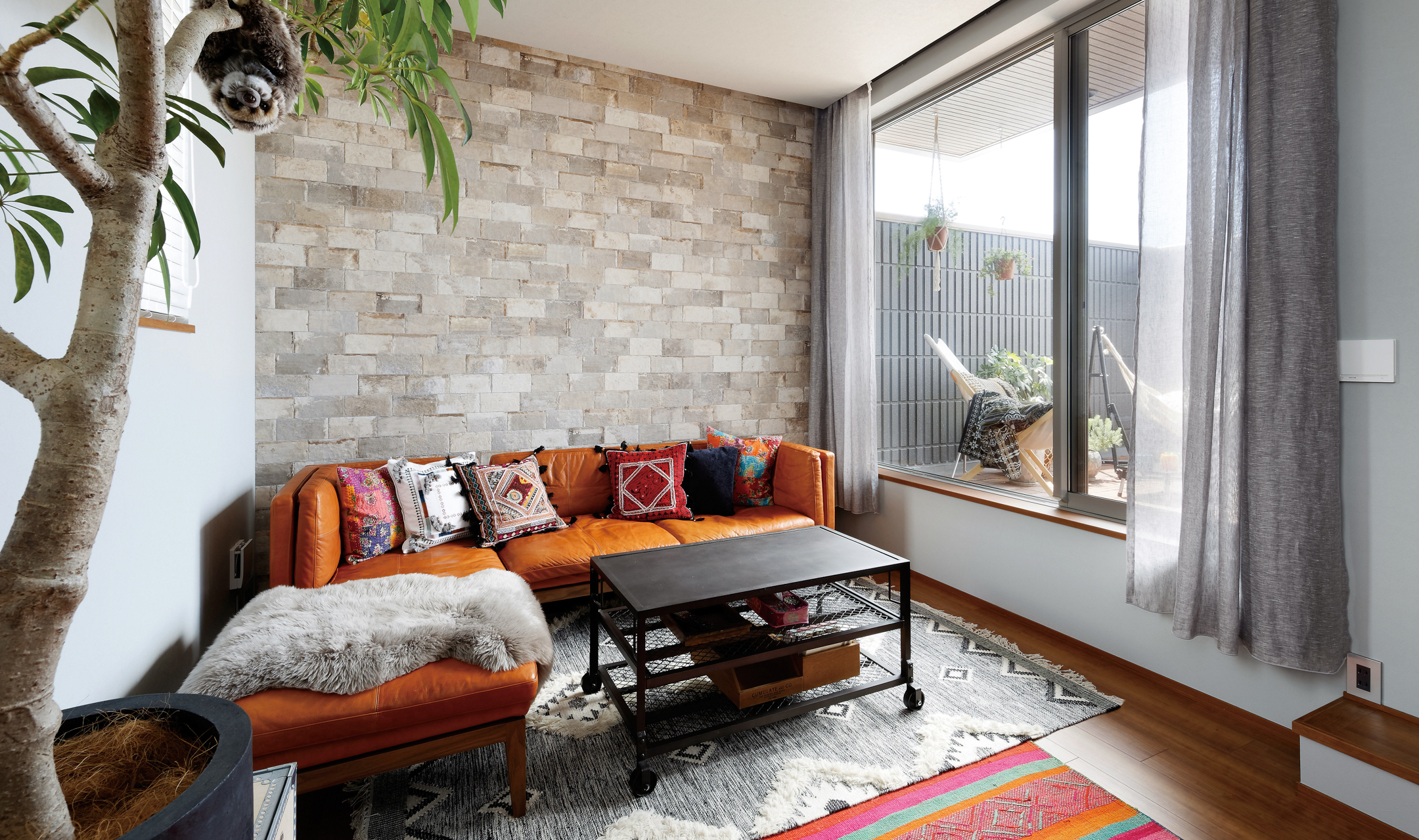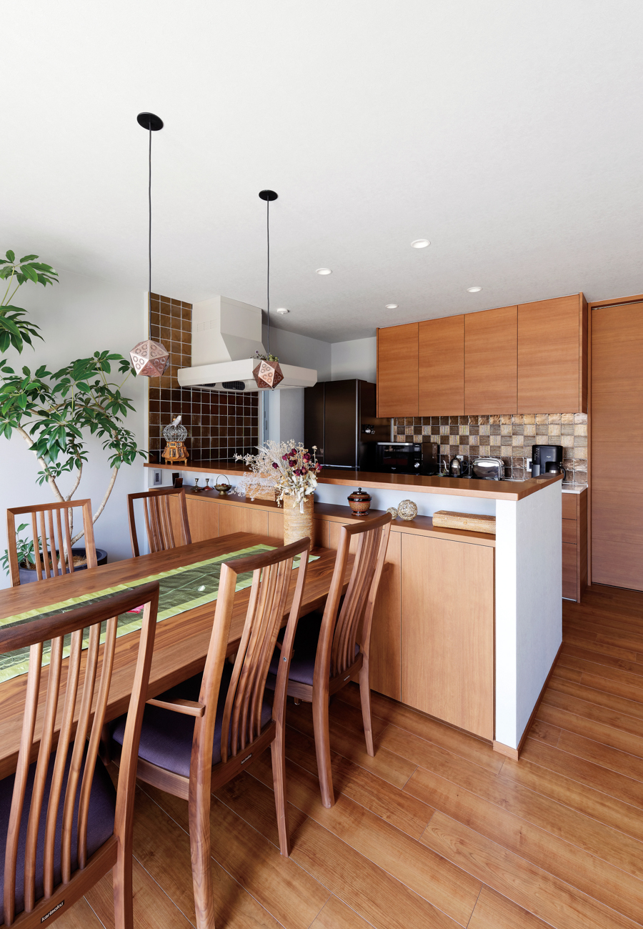 1階親世帯のLDK。ゴールドのタイルを貼ったキッチン、遊び心のあるペンダントライト、家具もアジアンリゾートのスタイルでコーディネート