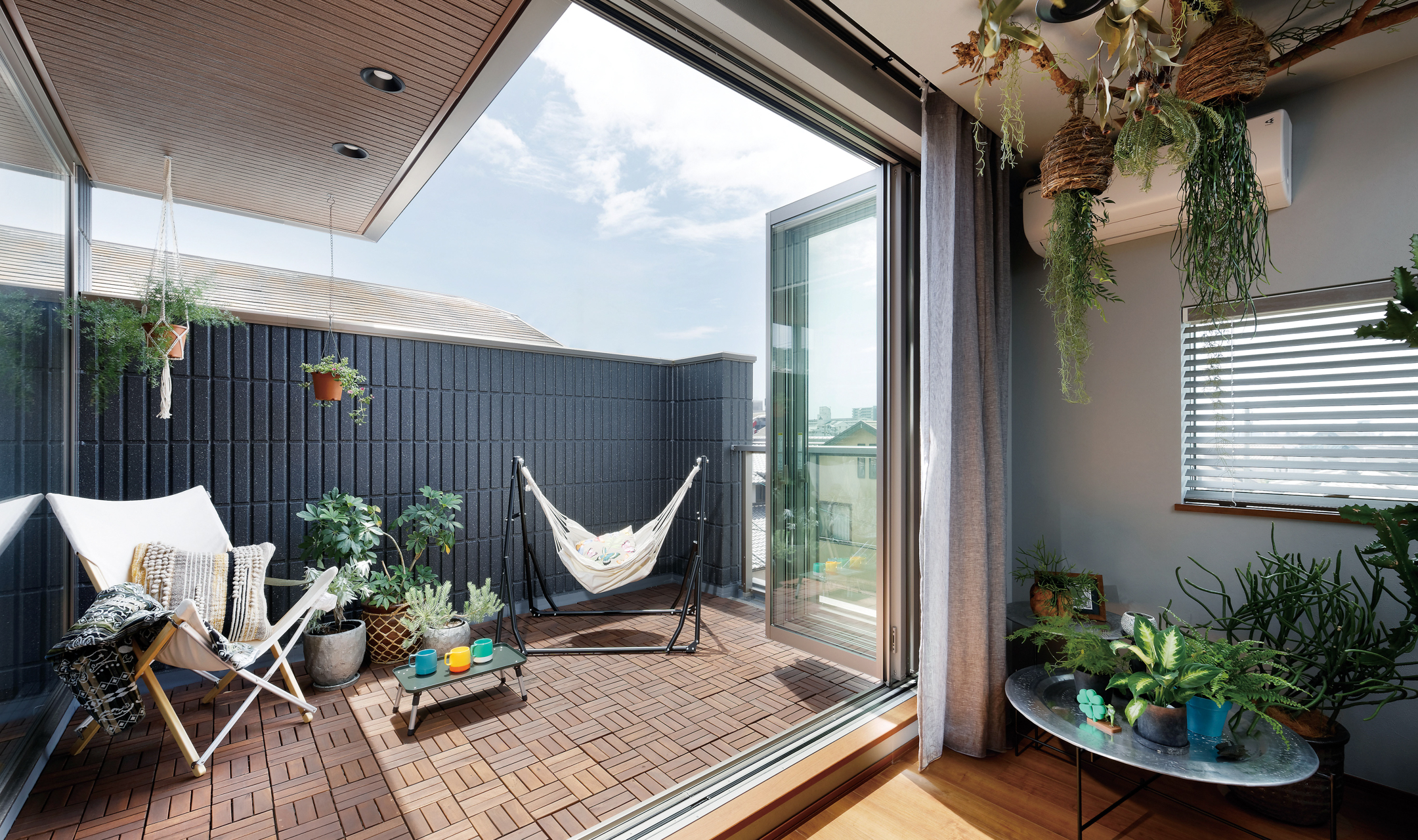 ダイニングとひとつながりでアウトドア空間として使えるバルコニー。隣家と接する側を壁で囲うことで、周囲の視線を気にせず自然の光と風を楽しめます