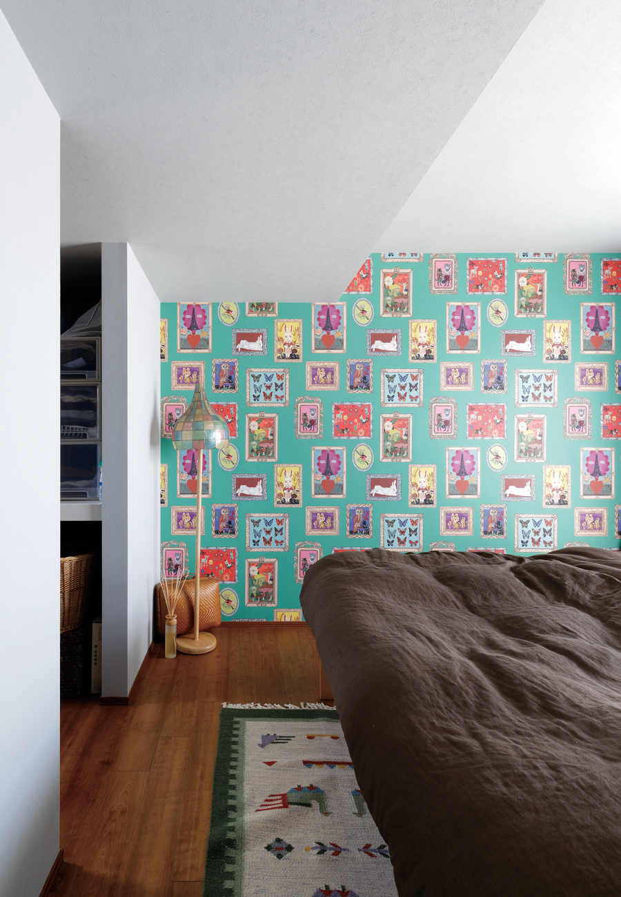 ポップな色使いが楽しい子世帯寝室。クローゼットと一体のオープンな設計。