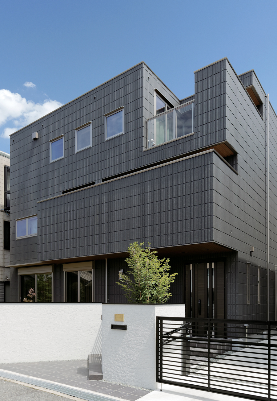 モノトーンの重厚感ある外観デザイン。フラットルーフには太陽光発電パネルを搭載。HEMSでエネルギーを賢く利用