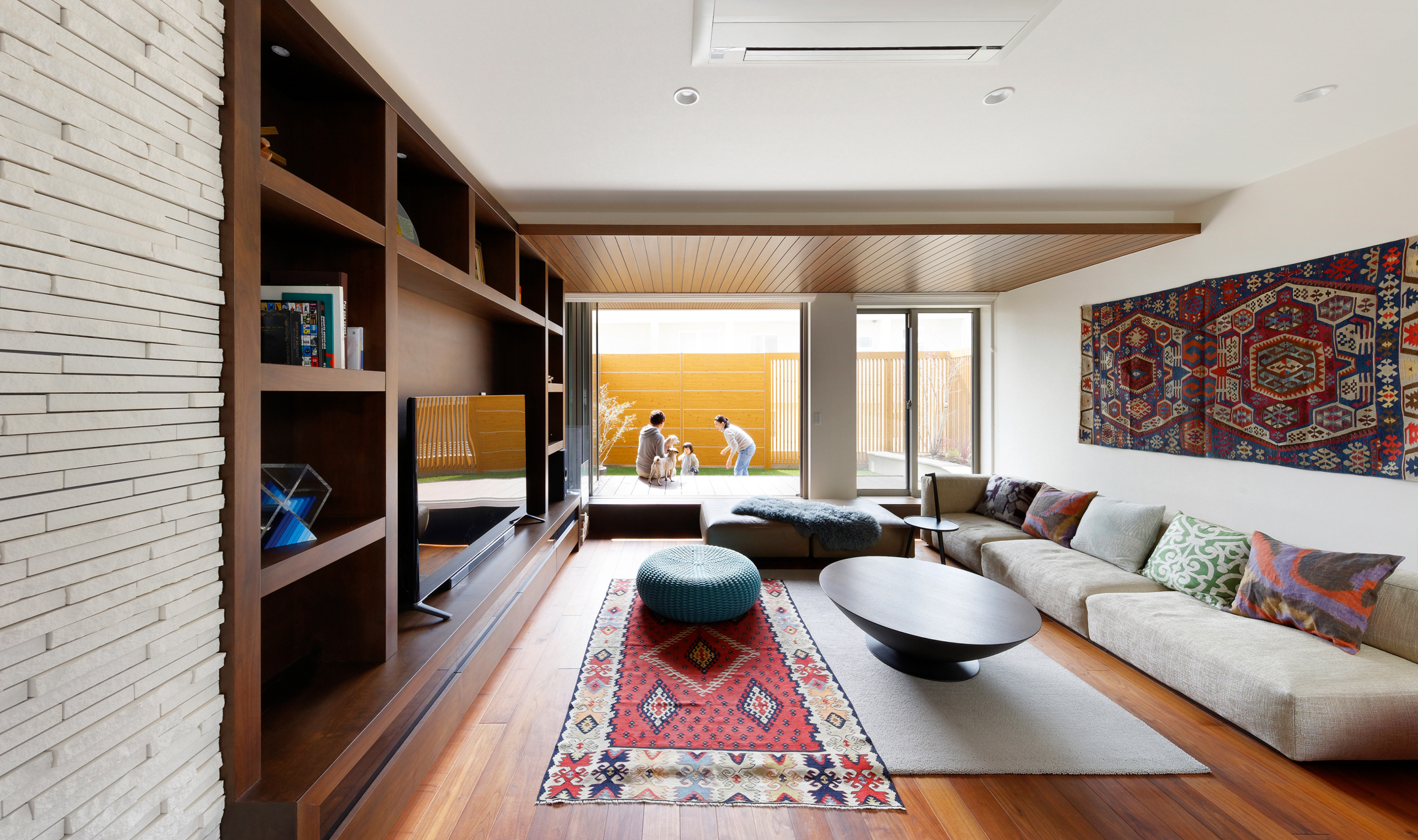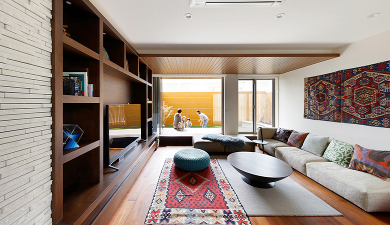 ダウンフロアを採用し、落ち着いたインテリアのリビング。ヴィンテージキリムが空間のアクセントに