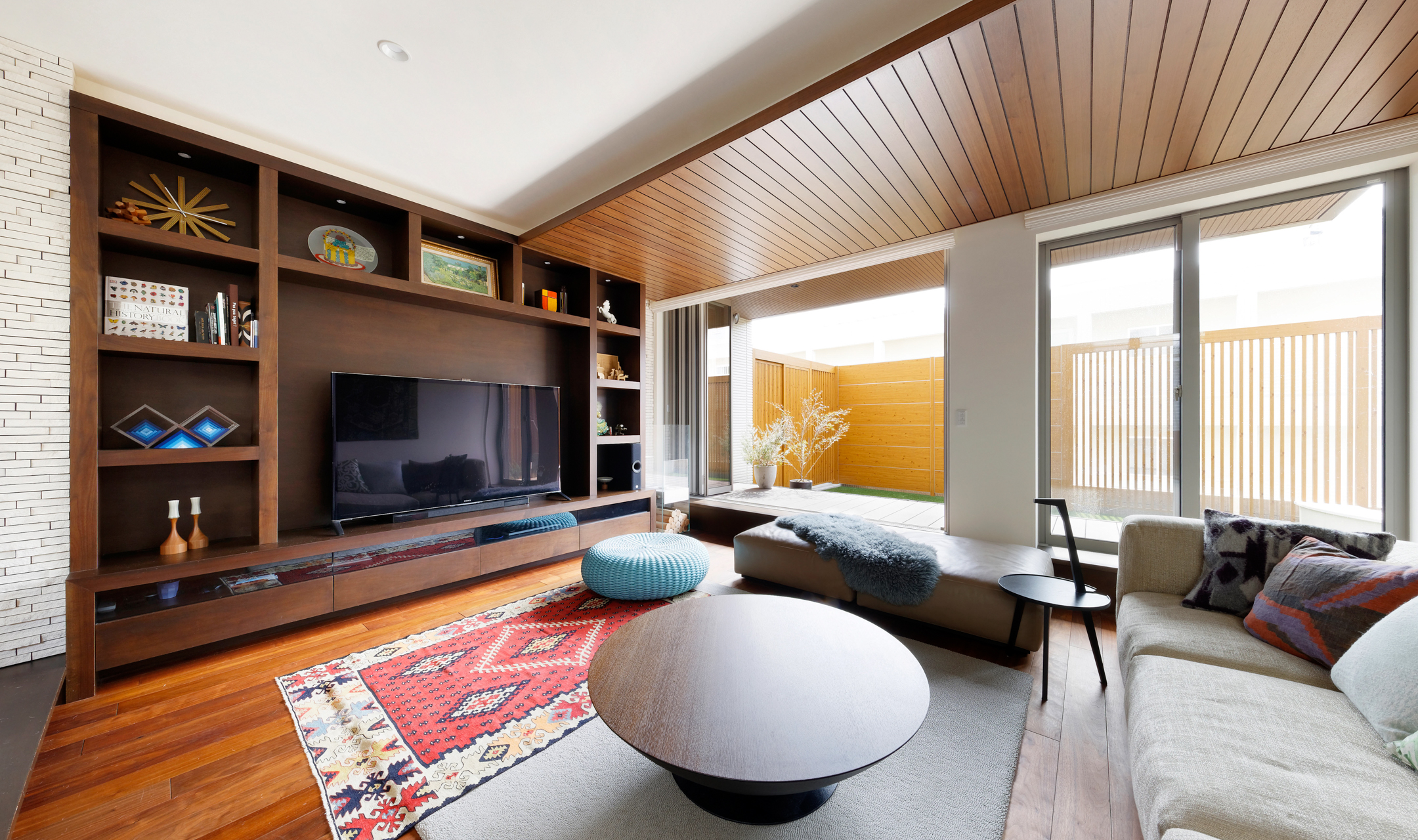 室内の木貼り天井が外の軒までつながる視覚的な演出で、室内とテラスが一体感のある空間に。壁一面も収納として活用し、お気に入りの小物を楽しまれています