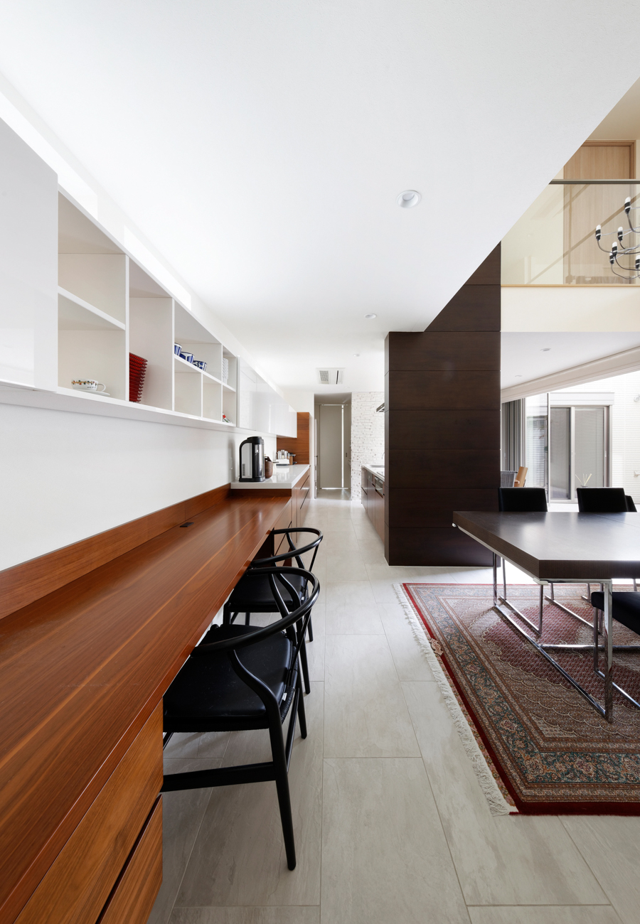 壁側に造作したカウンター。建物の奥行きを活かした機能的な設計です