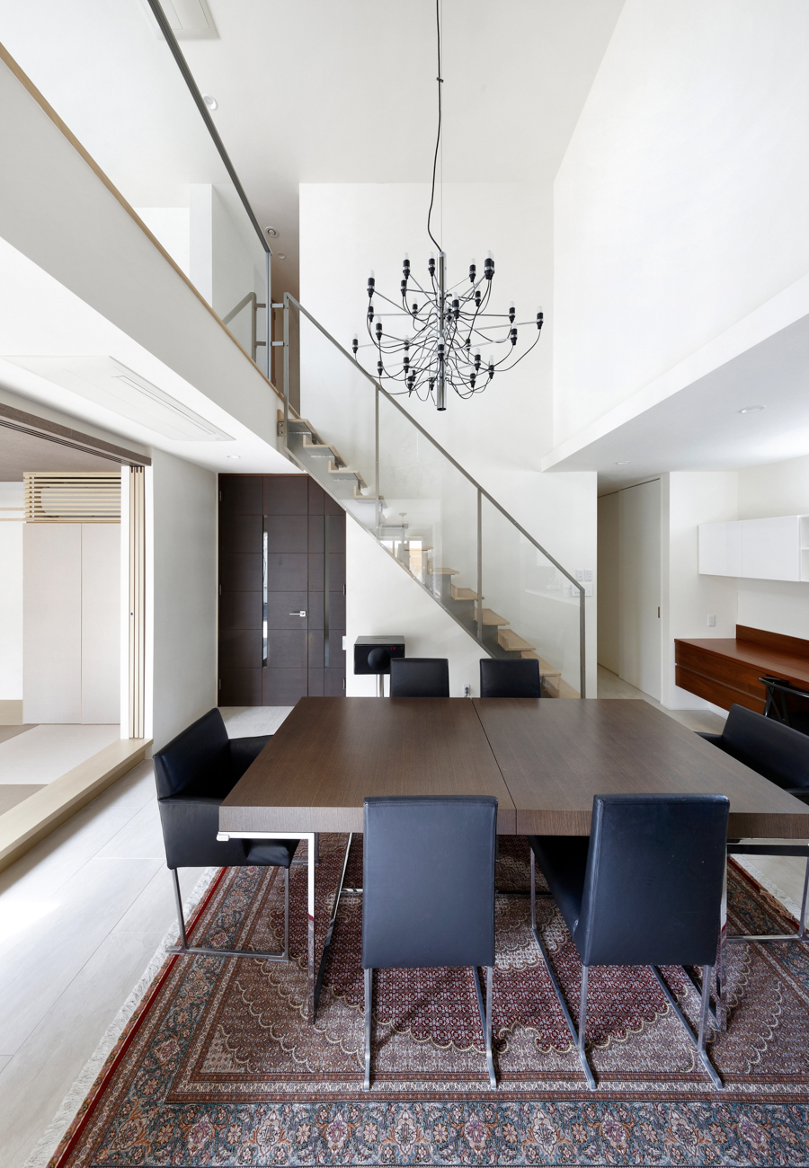 重量鉄骨造ならではの、ダイナミックな吹き抜けのメインダイニング。リビングやキッチンとは少し雰囲気を変えてシックなインテリアに