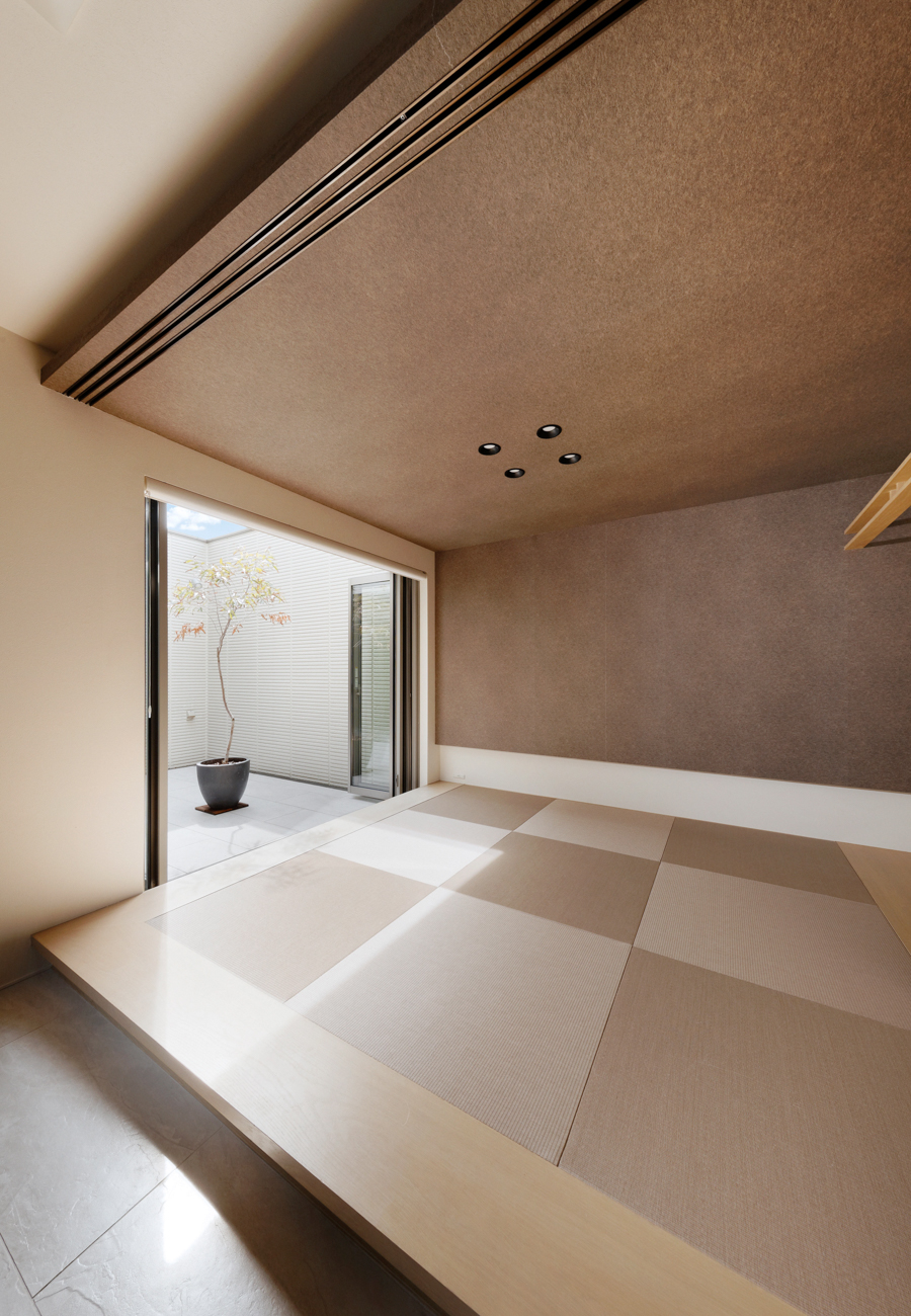 床上げ和室の上部は天井を少し落とし、オープンな空間のなかで変化を持たせています