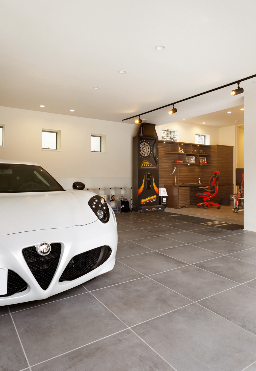愛車の置かれたホビールーム。ダーツなど趣味を楽しむ空間