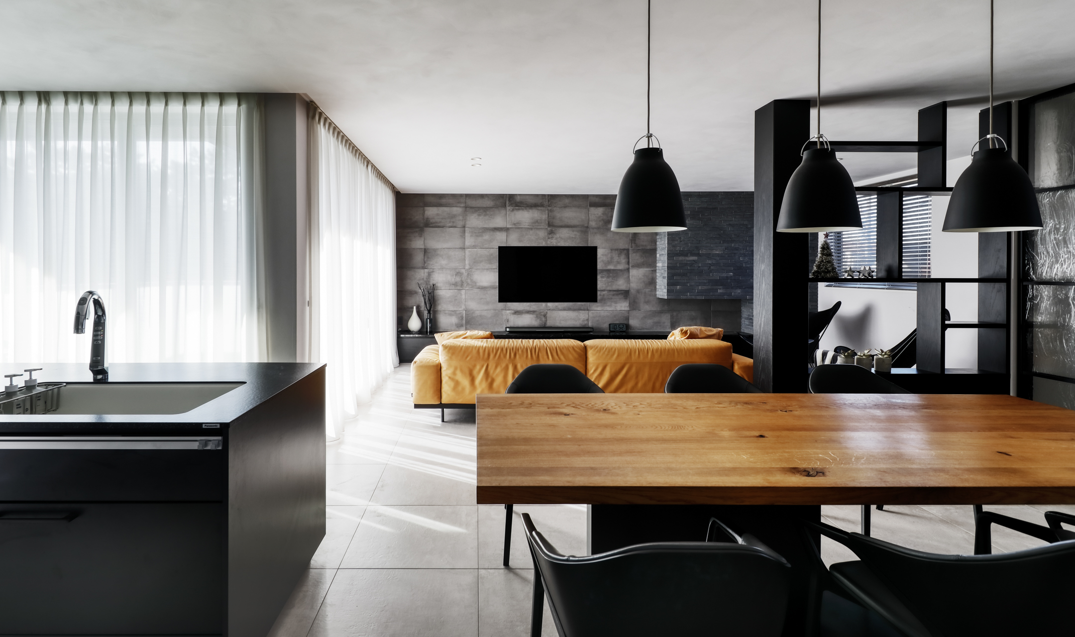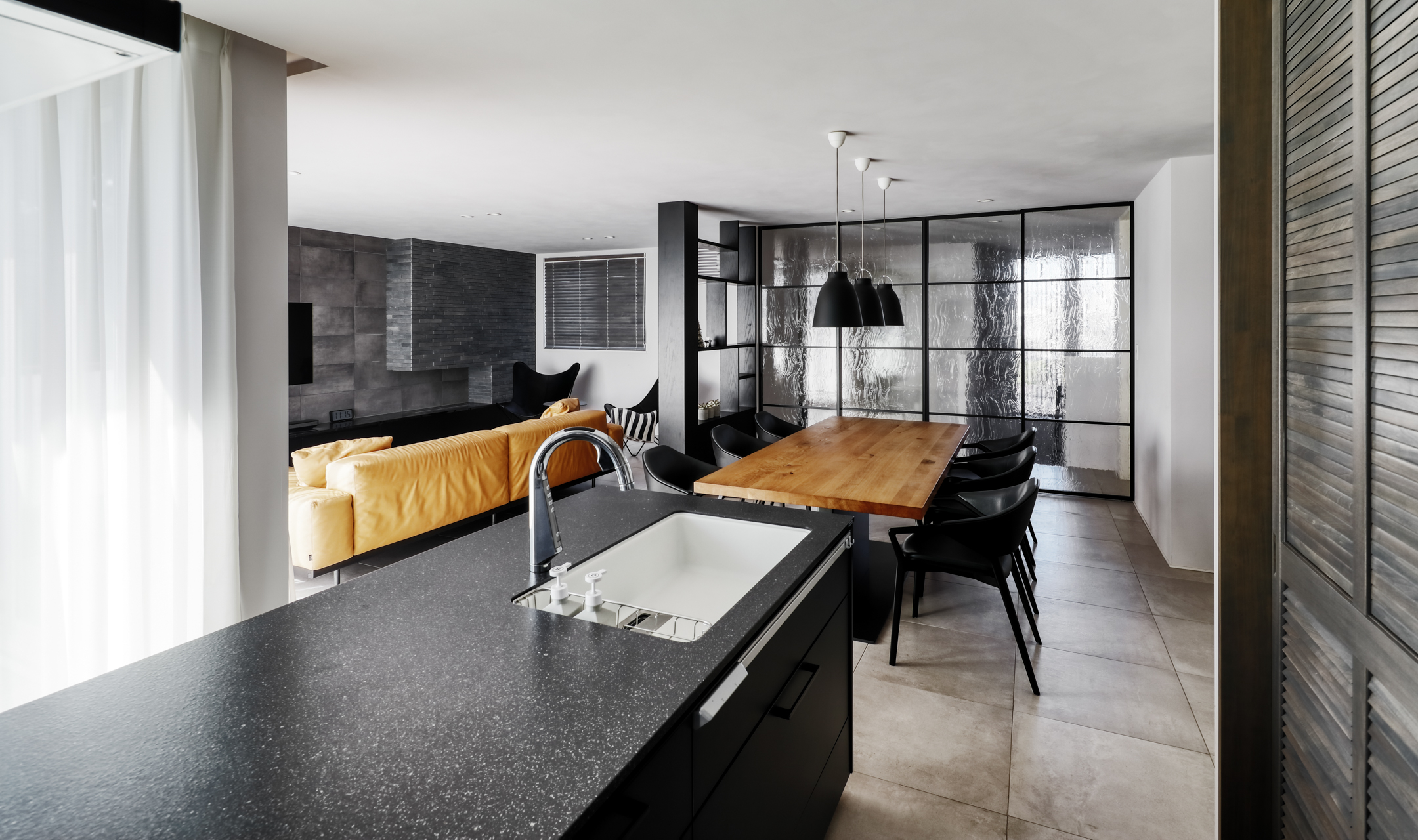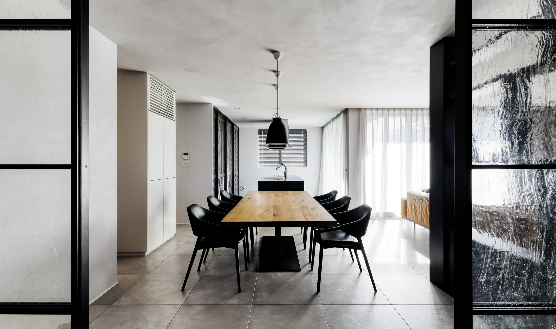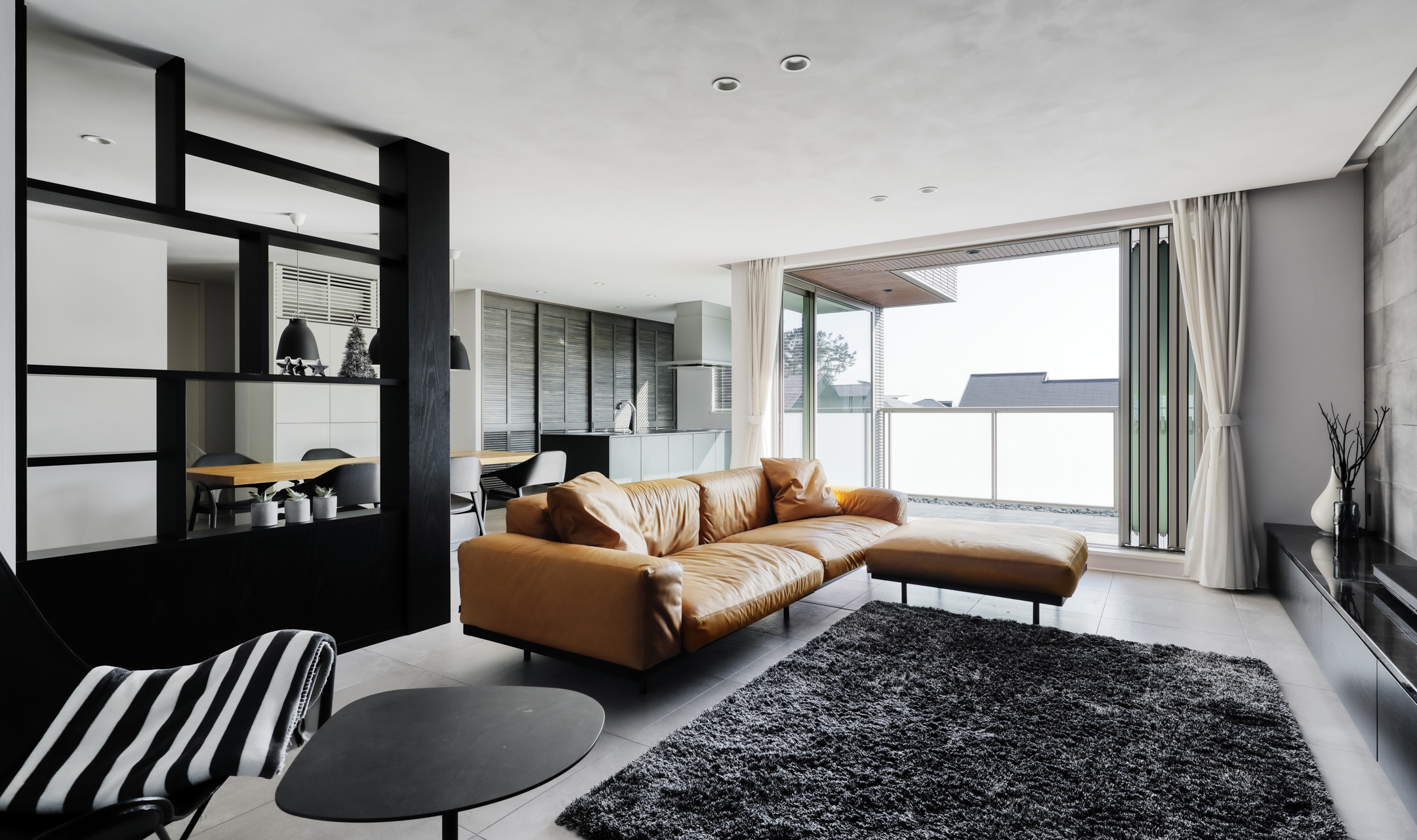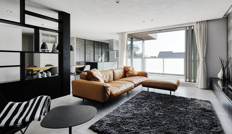 床や壁のタイル、照明器具、間仕切り収納や建具などをモノトーンで統一。明るめのレザーのソファとダイニングテーブルが空間のアクセントに