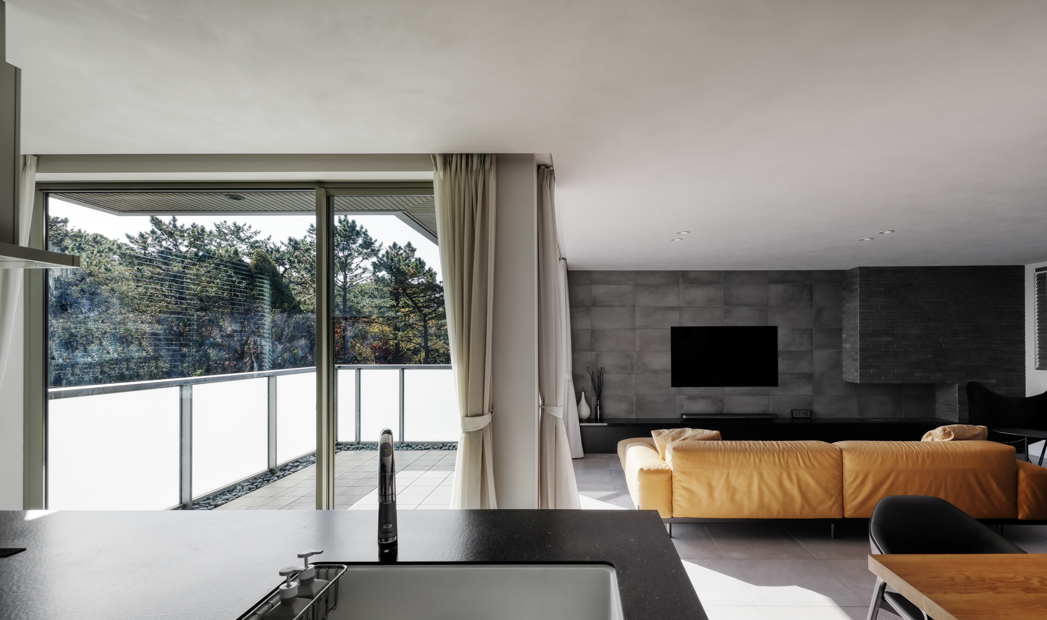 バルコニーをL字型に囲み、窓に面してキッチンを置くレイアウト。料理をしながら外の景色を眺められます