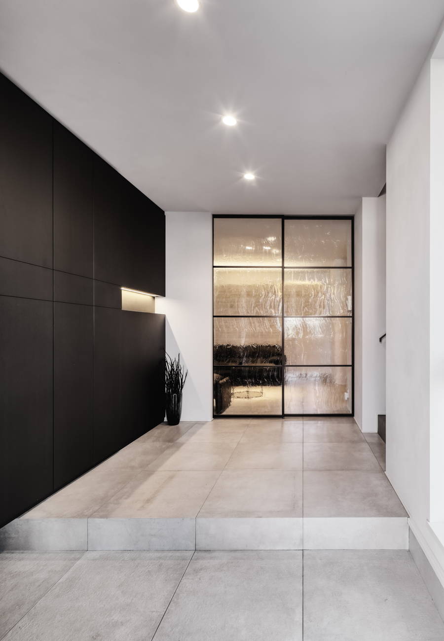 ゆったりとした玄関ホール。ガラス戸の奥は来客用の応接スペースに