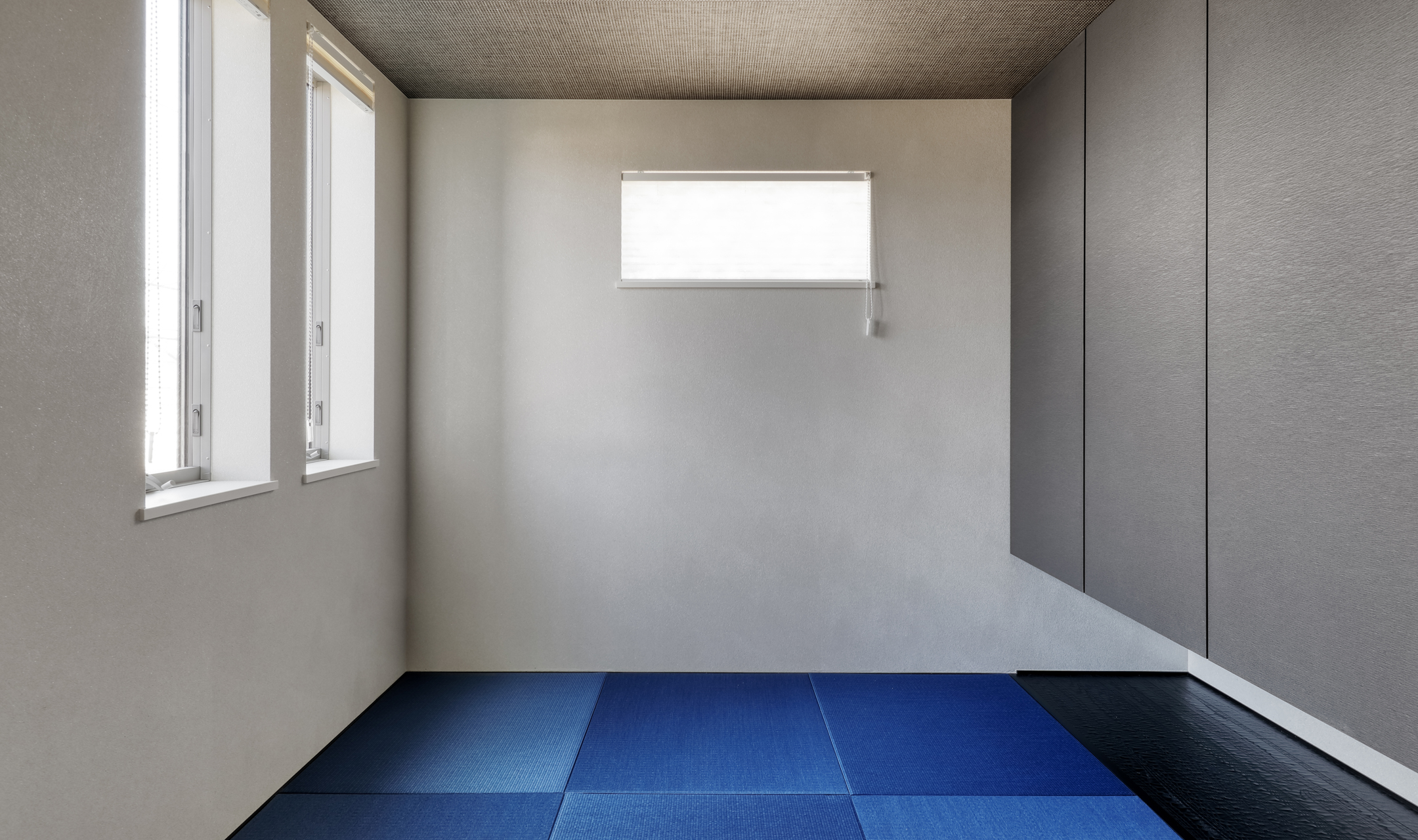 客間として設けた2階和室。鮮やかなブルーの畳を敷き、モダンな印象に