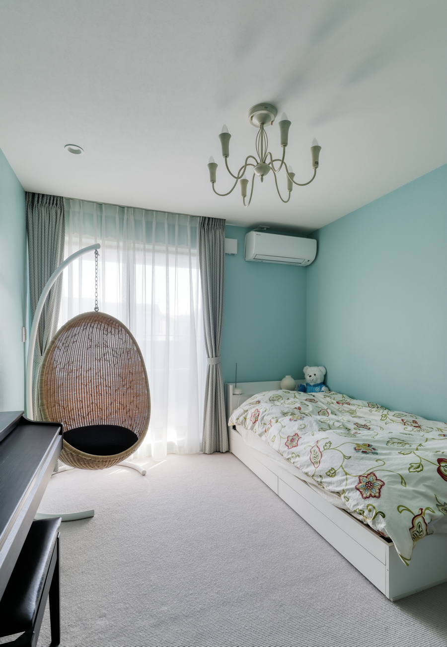 淡い色合いのクロスやシャンデリアで女の子らしく仕上げた子ども部屋