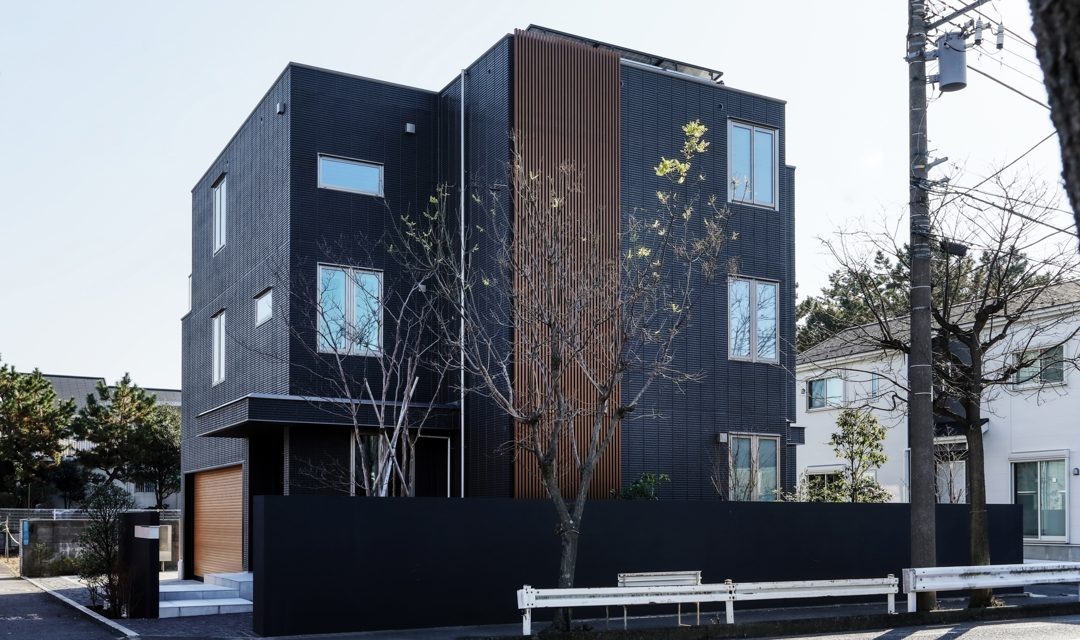 シックな色合いの外壁が街並みに映えるK邸。3層まで通した木調ルーバーが外観のアクセントに