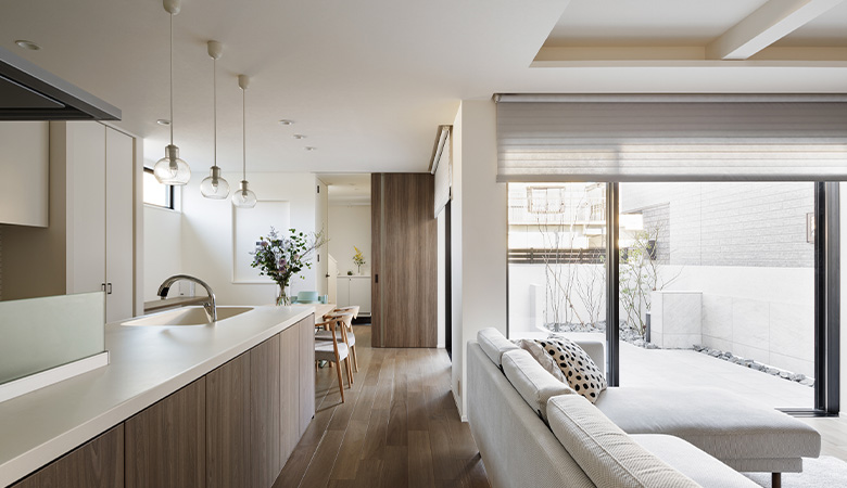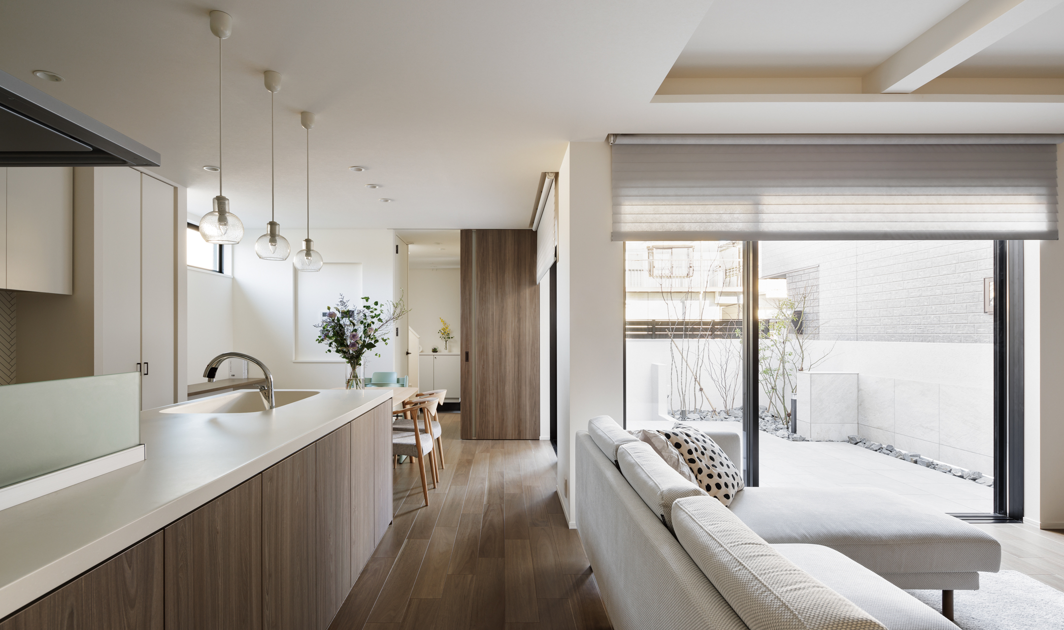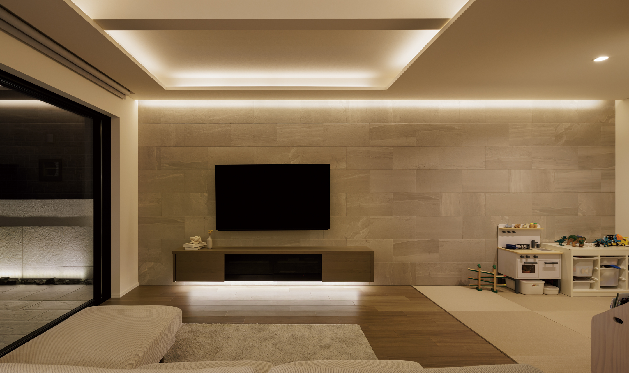 抜けの良い晴れやかな視界で居住空間を広く見せるテラス。小さな子どもも安心して遊べて、休日の団欒や大人だけの夜更かしも。