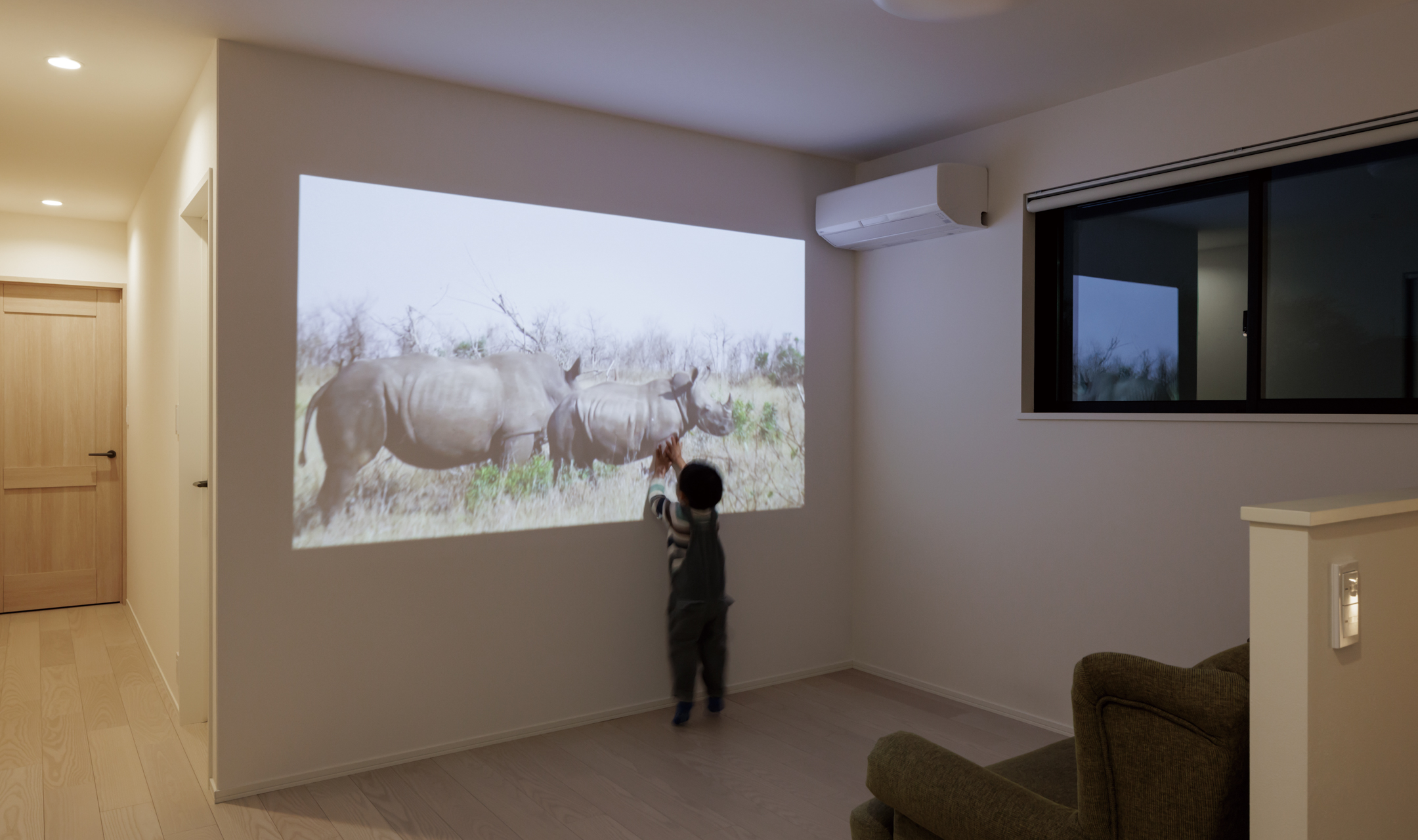 2階の階段ホールはホームシアター仕様のセカンドリビング。生活の変化に合わせて書斎や子ども部屋にも変えられる。
