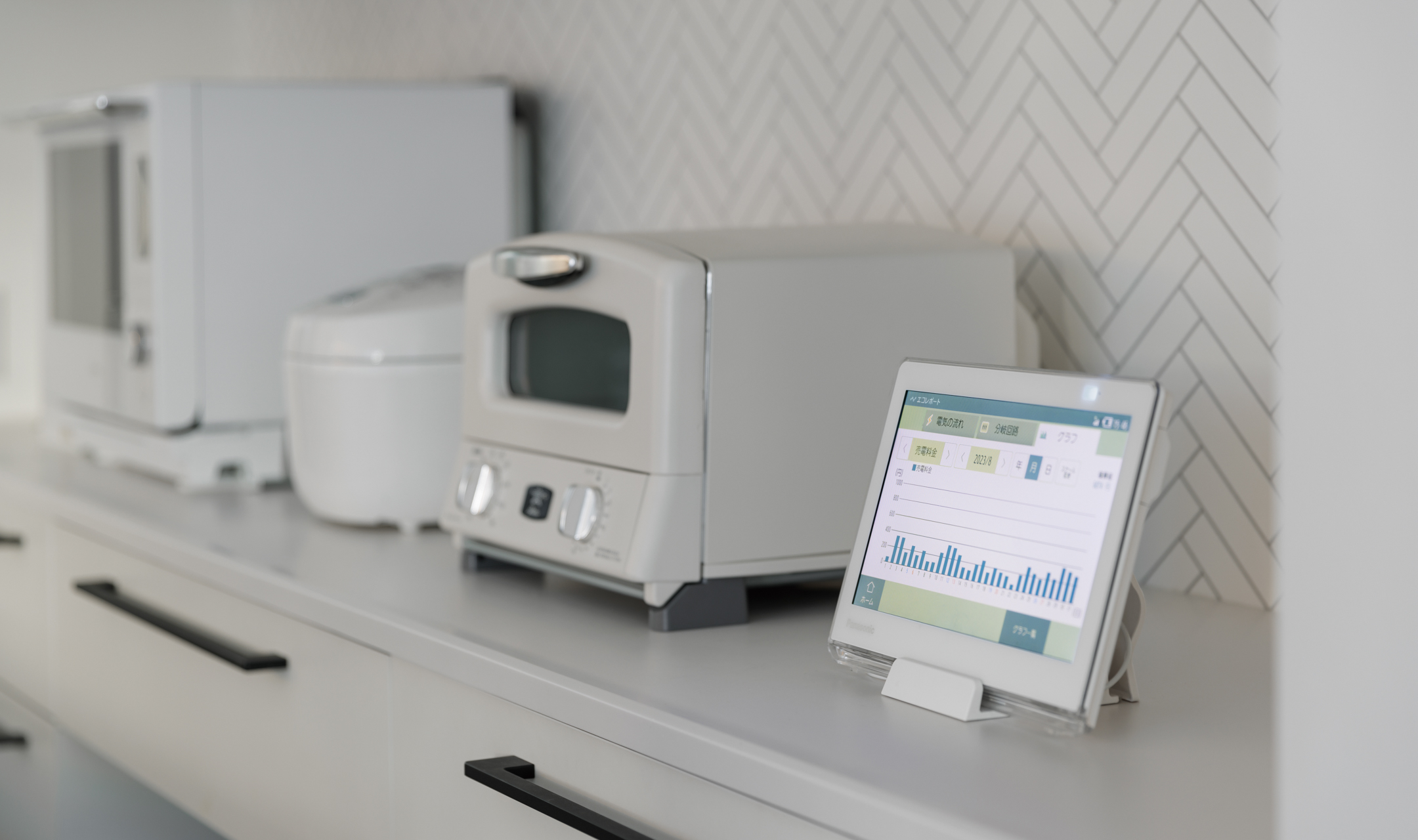 電気使用量が表示されるモニター。キッチン家電も省エネ仕様のものに総入れ替え。