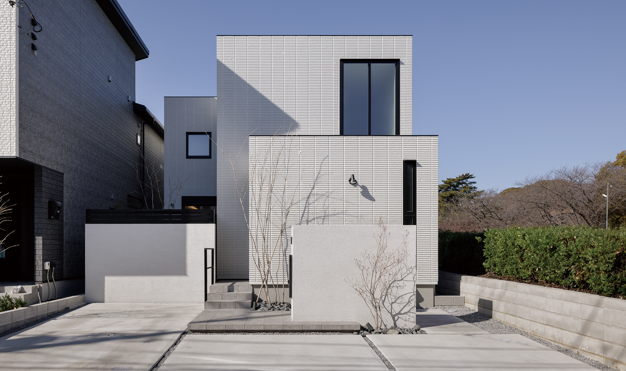 ファサードは、外構の塀と建物の3つのキューブを5層に重ねて奥行きを演出。ベランダ、駐輪場などを目隠ししたノイズレスなデザイン。
