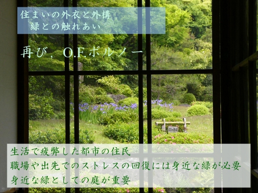 まず庭の緑です。ボルノーは、「生活で疲弊した都市の住民にとって、職場や出先でのストレスの回復には、身近な緑が必要であり、身近な緑として庭が最も重要である」と述べました。【右スライド参照】