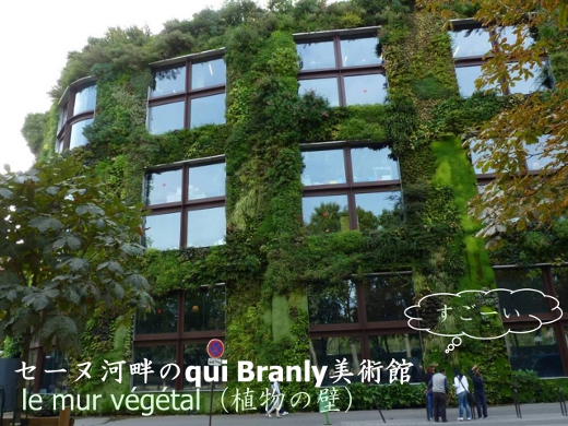 この数年の間にこういう壁面緑化、グリーンカーテン、緑のカーテンというのが急速に普及し始めています。フランスの植物学者・デザイナーのパトリック・ブランという人がいます。この写真ですがセーヌ河畔にあるケ・ブランリーというエスニックの美術館の外周にこのパトリック・ブランの壁面緑化があります。日本でも金沢市の21世紀美術館の中に「緑の橋」という作品があります。ブランの作品は、その地域にある植物を多く壁面に持ち込んで植えるということをやっていますので、現代の生物多様性にも配慮したものとも言えるでしょう。【右スライド参照】