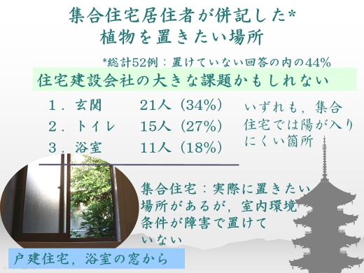 植物を置きたいところに置けていますかと聞きますと、4割ほどの人が、置けていないと回答しています。室内環境要因、すなわち窓がなく、光が当たらないなどという回答が4割、置く場所がないというのが4割でした。これを住宅様式ごとに分けて聞いてみると、一戸建て住宅では室内環境要因は、3割に満ちません。一方、集合住宅では5割に近い回答でした。この集合住宅の人たちに置きたい場所を併記してもらいました。その答えは玄関、トイレ、浴室が44%となりました。【右スライド参照】