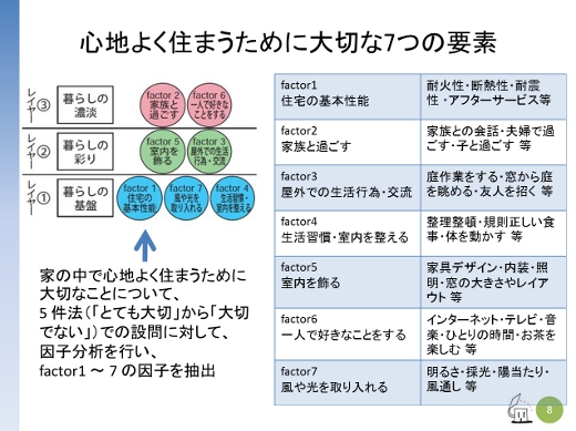 心地よく住まうために大切なことについて、一般戸建住宅にお住まいの方々に調査した結果、7つの要素が浮かび上がりました。まず、暮らしの基盤として「住宅の基本性能」「風や光を取り入れる」「生活習慣・室内を整える」こと。そのうえに、暮らしの彩りとして「室内を飾る」「屋外での生活行為・交流」。そして、暮らしの濃淡として「家族と過ごす」「一人で好きなことをする」。心地よく住まうために、この7つの機能を住宅が備えるべきだろうと考えられます。