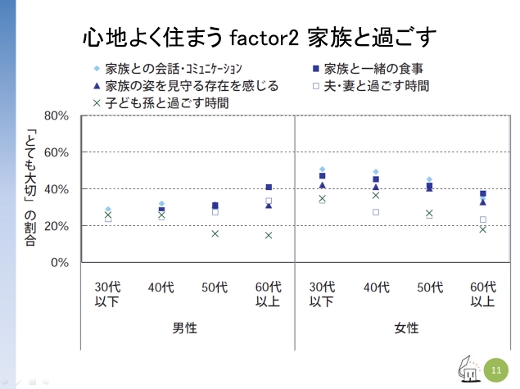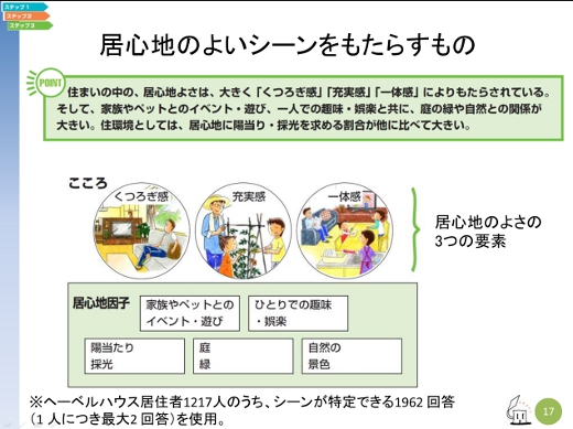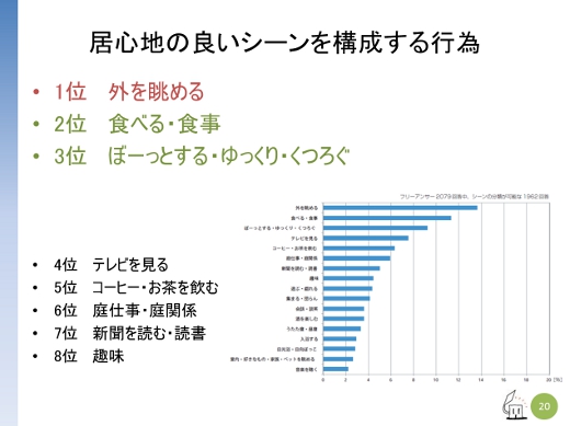 もう一つ、そういった住宅のなかで、どのようなときに居心地がよいと感じるか、居心地のよいシーンをフリーアンサーで分析しました。その結果、心の動きとしては、くつろぎ感、充実感、一体感によってもたらされていました。居心地のよいシーンを構成するのは「外を眺める」「食べる・食事」「ぼーっとする・ゆったりする・くつろぐ」シーンが上位を占め、居心地の良さを支える居心地因子としては、家族やペットとのイベント、遊び、一人での趣味、娯楽とともに庭の緑や自然との関係が大きく見られました。また、住環境としては居心地に陽当たり、採光を求める割合が他に比べて大きい結果でした。
