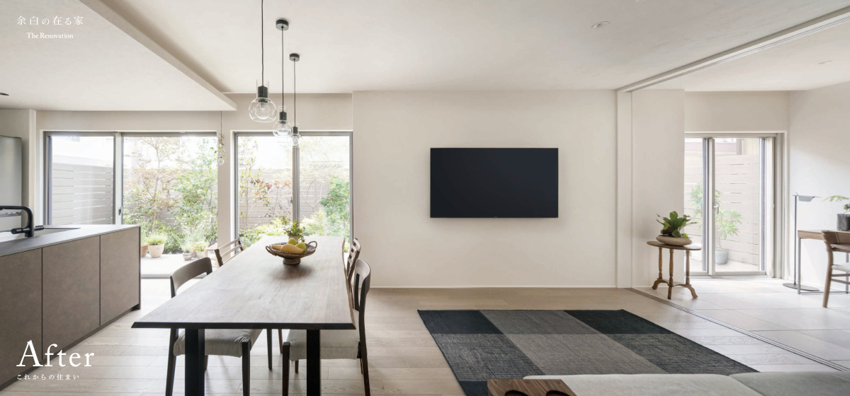 仕事や子育ての忙しさや、親の今後について考えたりと、心身ともに忙しく過ごしている現代の50代が忘れがちなゆとり〈余白〉を生み出し、しなやかでゆとりある暮らしを実現するワンフロアリノベーションです。