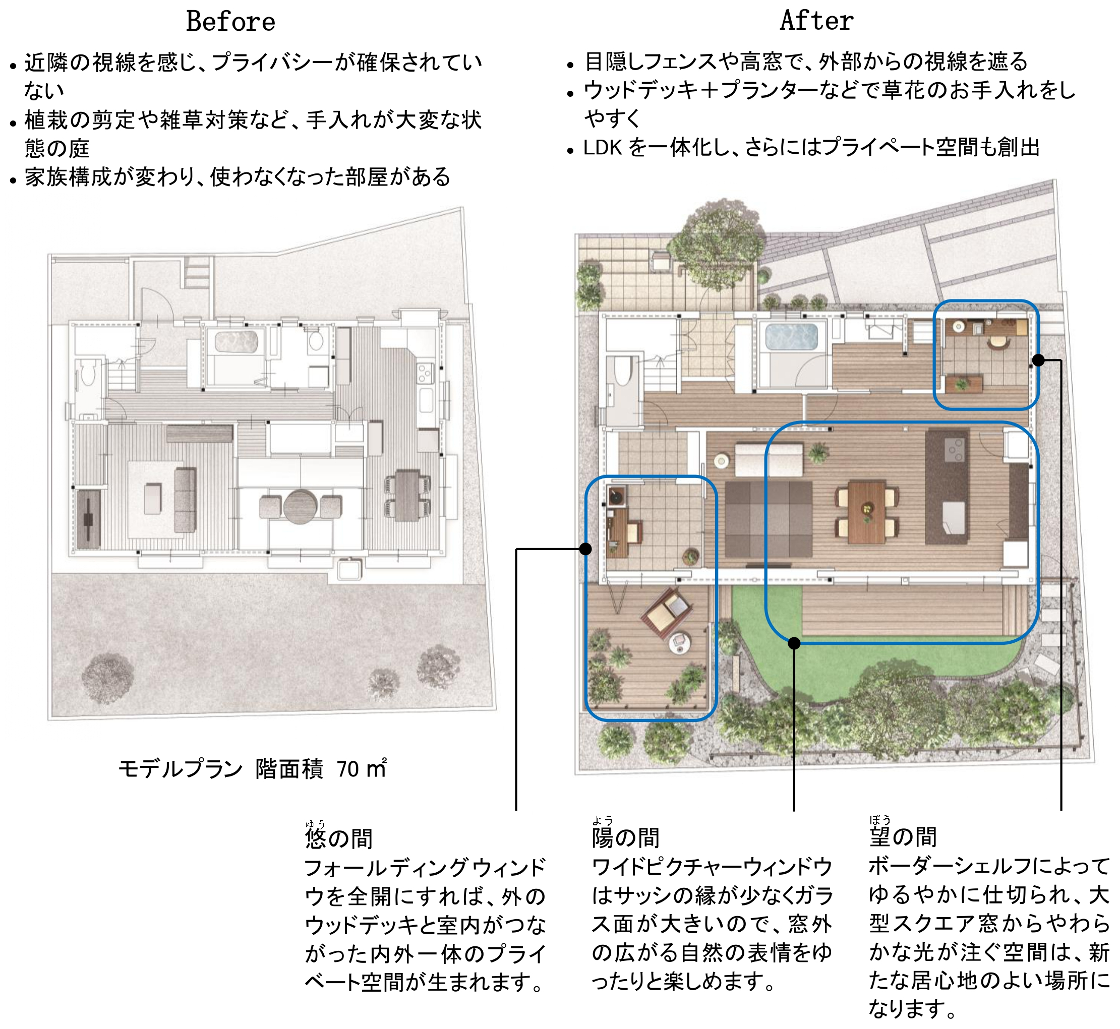 ◆「余白の在る家 The Renovation」の特徴 Ⅰ.忙しい日常に〈余白〉というゆとりを生み出すワンフロアリノベーション提案 Ⅱ.家族それぞれの居場所となる3つの「間」によりしぜんごこちの豊かな暮らしを実現 Ⅲ.目隠しなどでプライバシーを保ちながら、新たに採用した窓を活かすことで開放的で自然の恵みを五感で感じる空間を創出 |