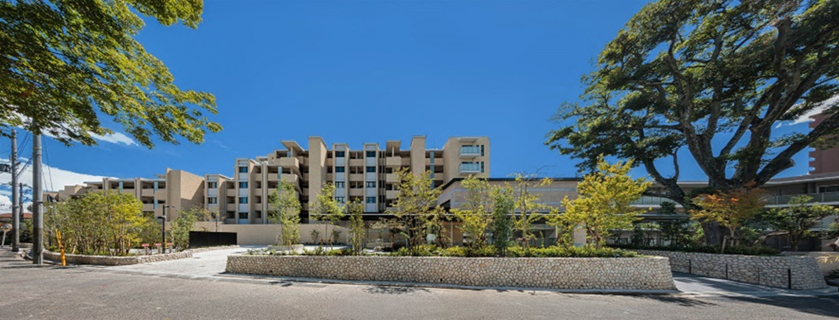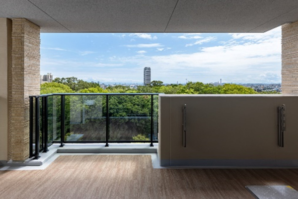 本物件は大阪・神戸の中間、六甲山の麓に位置し、南側には美術館や庭園が広がる集合住宅です。明治以降、富裕層の邸宅街として発展してきた御影山手の歴史と、長く住む住民の街並みへの強い愛着を背景に建替え事業が進められました。従来居住者の「近隣住民にも喜ばれる建替えにしたい」という声を基に、建物は周囲への圧迫感を抑えるため南側に寄せ、効率的なL型ではなくあえてI型配置を選択しました。それにより生まれた余白には、御影の地に永く愛される石積や公園、隣地所有者とも同意の上保存した大樹を配し、街並みと調和する景観を目指しました。また、余剰容積を活用してバルコニーの奥行を2.5mとし、南側の眺望に余白を設けることで、屋内にも広がりを感じられる空間を実現しています。