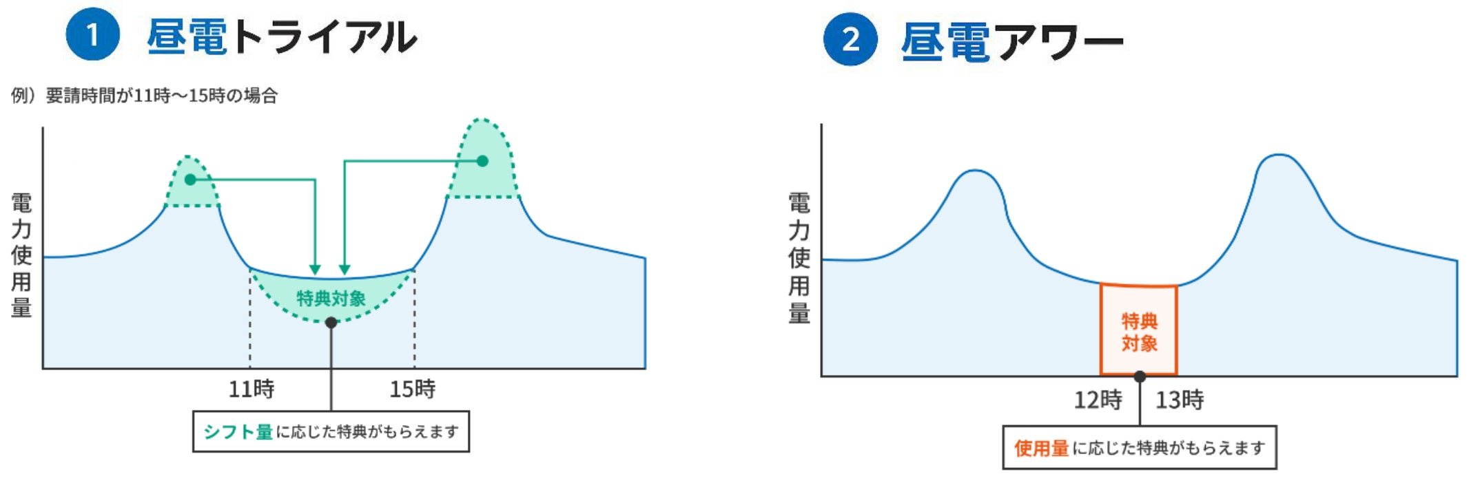| 判定方法 | ① 昼電トライアル:お客様ごとに標準的な電力使用量を設定し、実施日における電力使用量と比較して、変化量を判定する。 ② 昼電アワー:実施期間中12~13時における電気使用量を測定する。 |