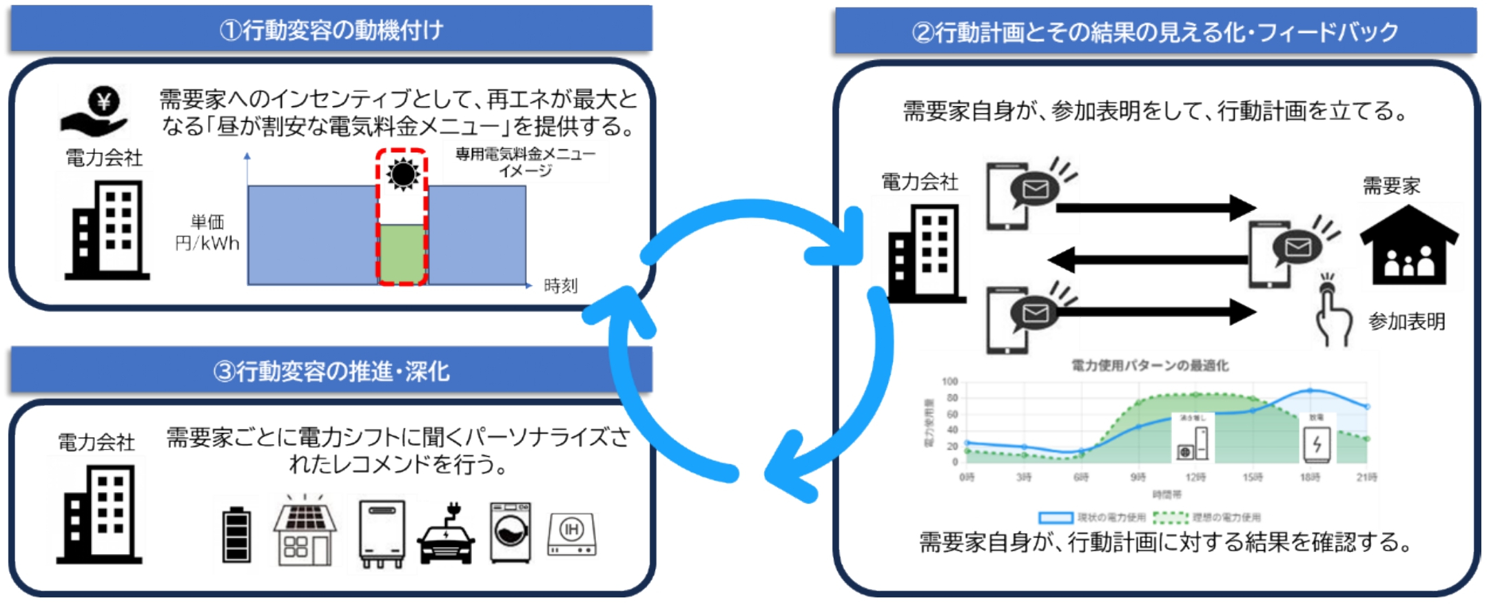 | 取組内容 | ① 昼電トライアル:へーベル電気から毎週土曜日に配信するメールに記載された日時に電気の利用を増やしていただきます。 ② 昼電アワー:12~13時において、電気使用量を増やしていただきます。 |