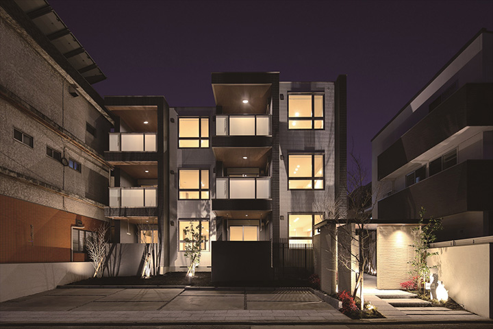 特徴的な深い軒とエントランスゲート。美しい照明との調和によって入居者を誘います。